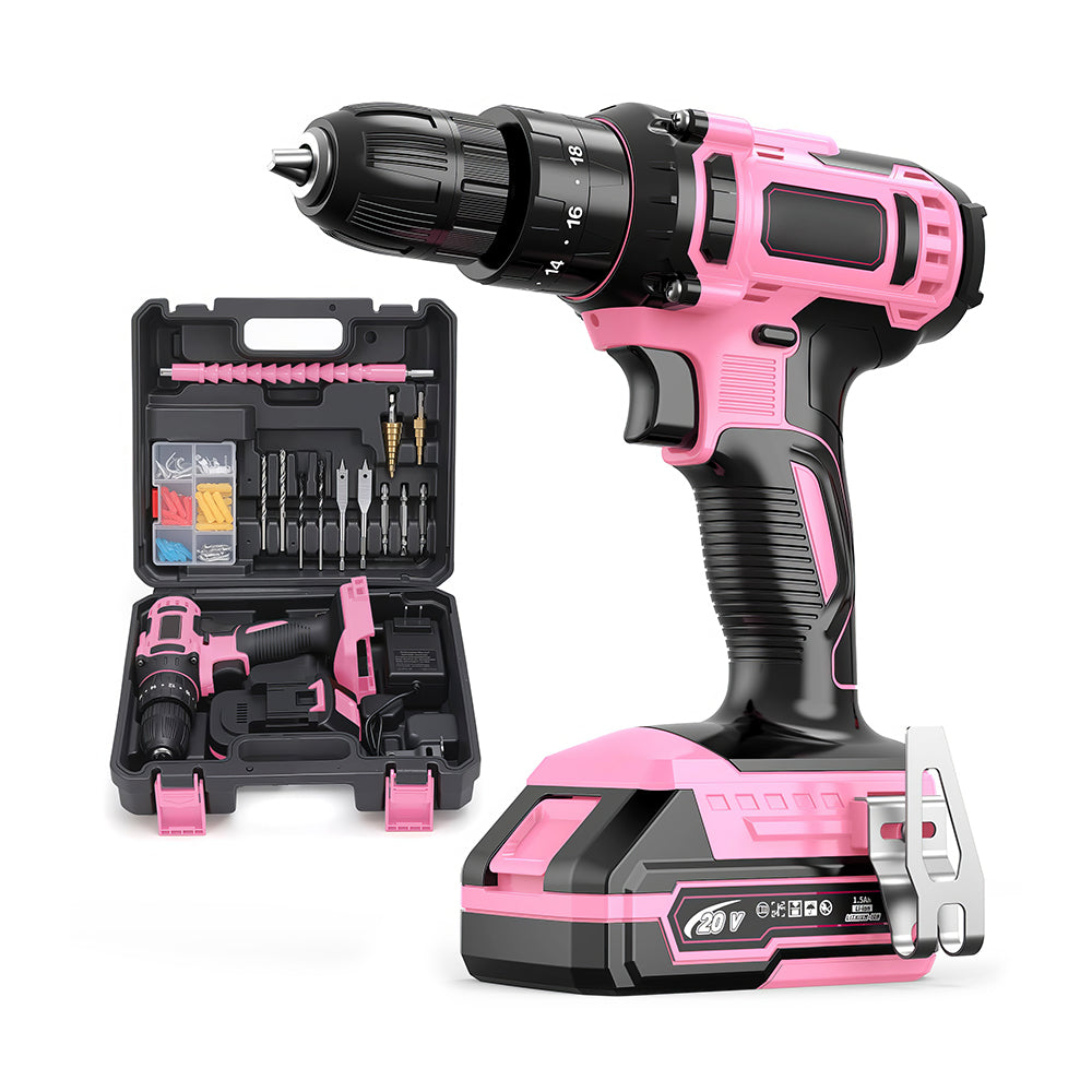 Powerful 20V cordless electric drill with dual-speed control (0-550 / 0-1550 RPM) and 18+3 torque settings for precise drilling and screwing. Equipped with a 1500mAh lithium-ion battery, quick 1-hour charger, and 3/8" keyless metal chuck. Built-in LED light enhances visibility in dark work areas. Comes with 72 high-quality driver bits and a carrying case for home repairs, woodworking, and DIY projects.